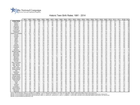 This chart tracks teen birth rates in the United States from 1991 through 2014.